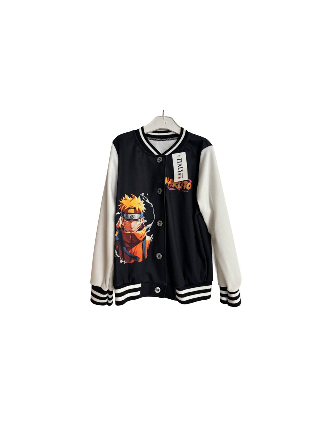 Veste teddy Naruto noire avec des dessins de Naruto en orange sur le devant et le dos. Style streetwear, parfait pour les fans de Naruto Shippuden.